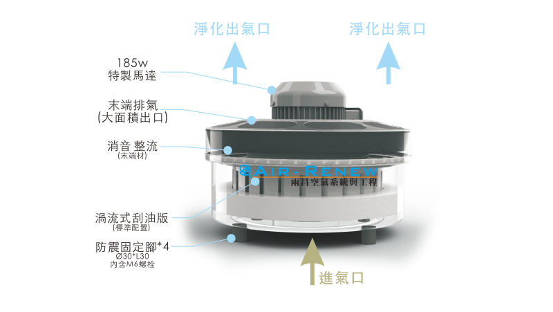 1.搭配現場可使用外排空氣或內排 2.搭配高效率風機,有效克服濾網壓損 ,吸力持久 3.低振動設計使用 4.專利渦流過濾刮油機構 5.依產業使用選配末端過濾材